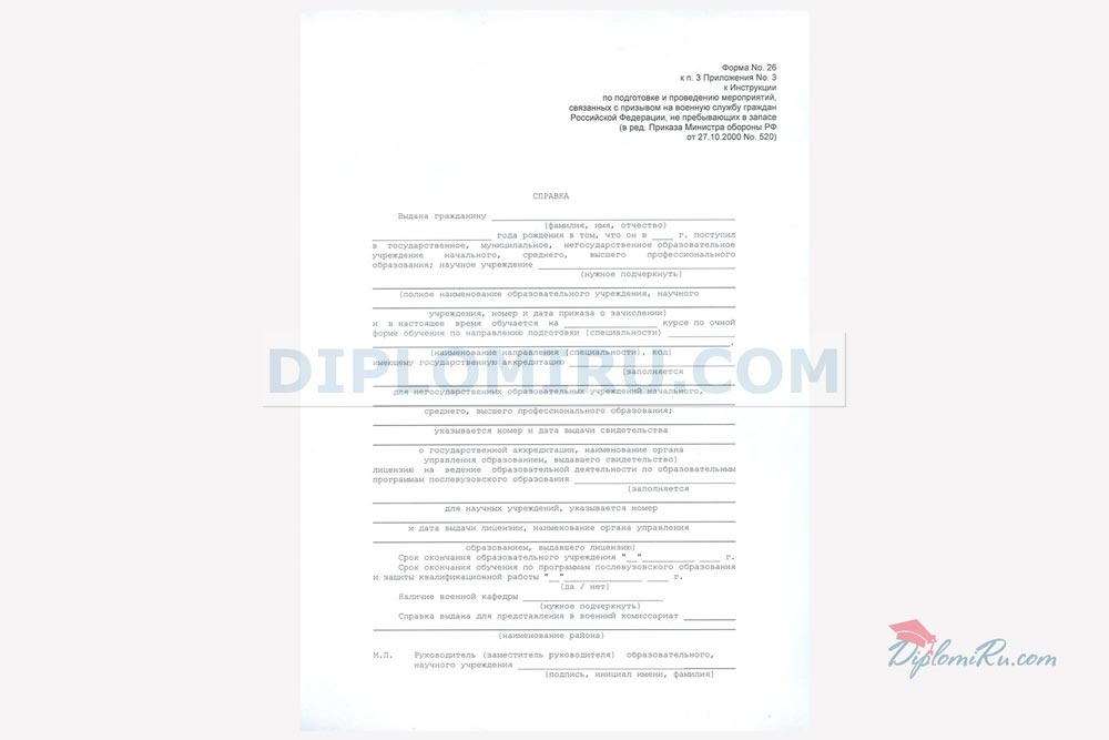 На нашем сайте Вы можете купить справку для военкомата по форме 26 об обучении в ВУЗе. Справка изготавливается на обыкновенной бумаге формата А4, заполняется по стандарту или по образцу реально выданных в том или ином учебном заведении справок. За долгие годы работы мы накопили огромное количество таких образцов и готовы сделать их точную копию, но с Вашими данными. Печати и подписи соответствуют оригиналам.