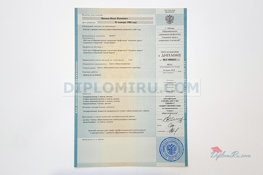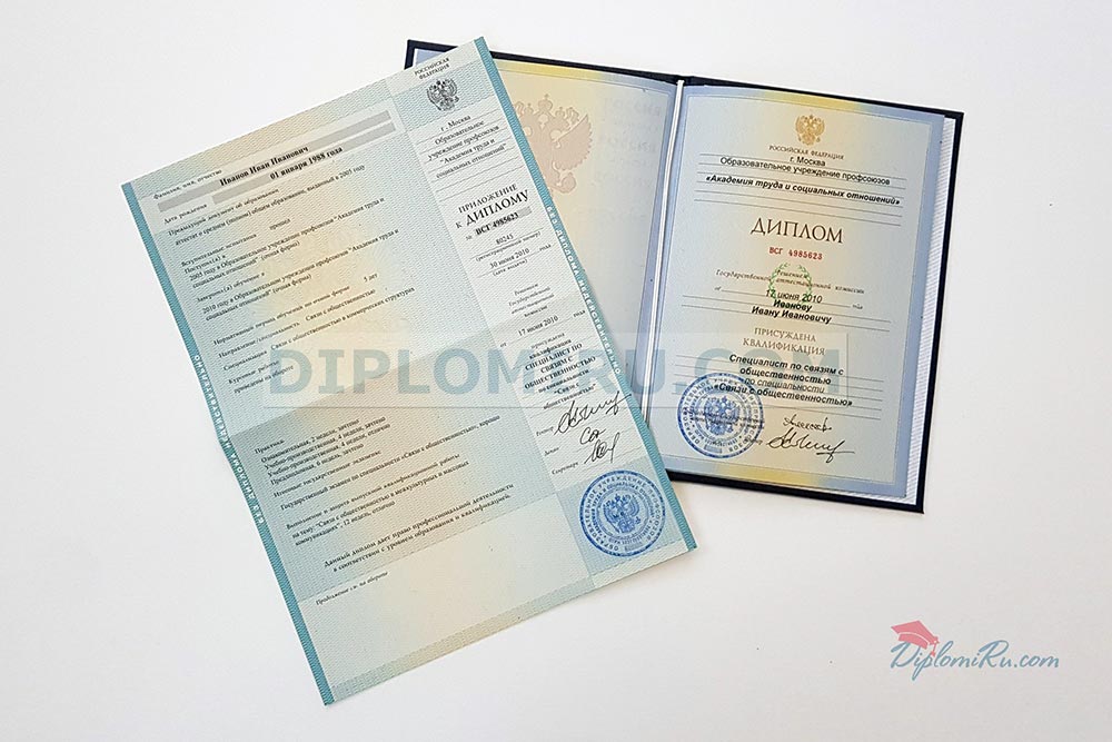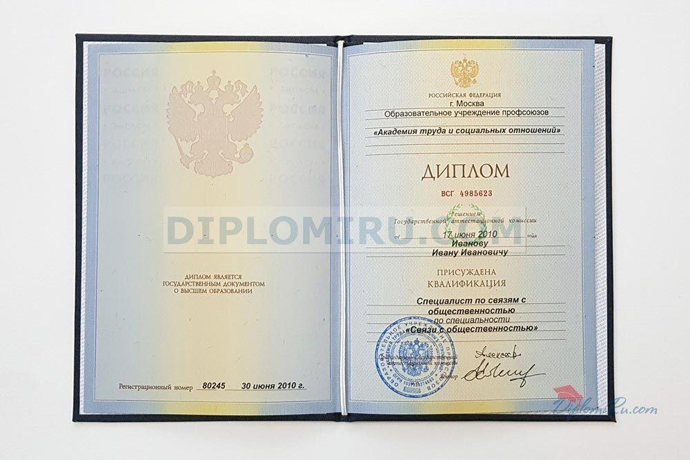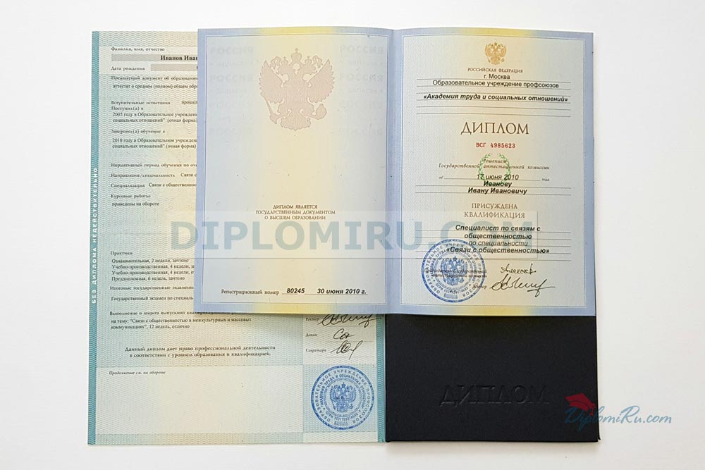 Диплом об окончании ВУЗа в 2010, 2011 годах. Нумерация бланка состоит из 2-х букв и 7-ти цифр. В работе используем только настоящие защищённые бумаги, заполняем как по стандартам Министерства образования России, так и по образцам документов, реально выданных тем или иным учебным заведением. На фото выше представлены заполненные корочки - точная копия оригинального диплома, выданного одним из Московских университетов.